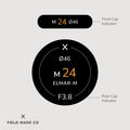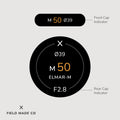 Each label, sold separately, includes a front and rear cap indicator for Leica M lenses, displaying focal length, aperture, filter size, and lens designations. Crafted in Montreal, Canada, from durable, UV and scratch-resistant matte vinyl from North America with outdoor rated adhesive, these indicators offer lasting performance and a sleek, professional appearance.