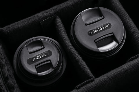 Each label, sold separately, includes a front and rear cap indicator for Canon EF lenses, displaying focal length, aperture, filter size, and lens designations. Crafted in Montreal, Canada, from durable, UV and scratch-resistant matte vinyl from North America with outdoor rated adhesive, these indicators offer lasting performance and a sleek, professional appearance.