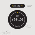 Each label, sold separately, includes a front and rear cap indicator for Nikon Z lenses, displaying focal length, aperture, filter size, and lens designations. Crafted in Montreal, Canada, from durable, UV and scratch-resistant matte vinyl from North America with outdoor rated adhesive, these indicators offer lasting performance and a sleek, professional appearance.