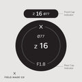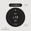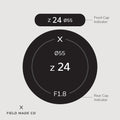• Rear indicators feature the filter size, focal length, aperture & lens designations.