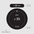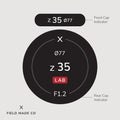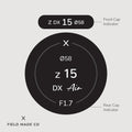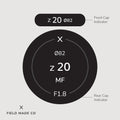 Premium individual labels for front & rear lens caps featuring focal length, aperture, filter size and lens designations.