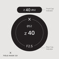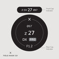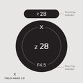 Each label, sold separately, includes a front and rear cap indicator for Viltrox - Nikon Z lenses, displaying focal length, aperture, filter size, and lens designations. Crafted in Montreal, Canada, from durable, UV and scratch-resistant matte vinyl from North America with outdoor-rated adhesive, these indicators offer lasting performance and a sleek, professional appearance.
